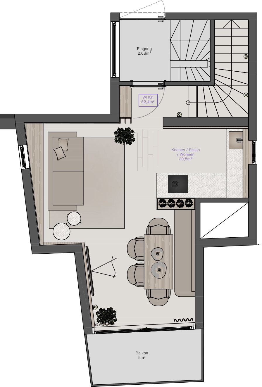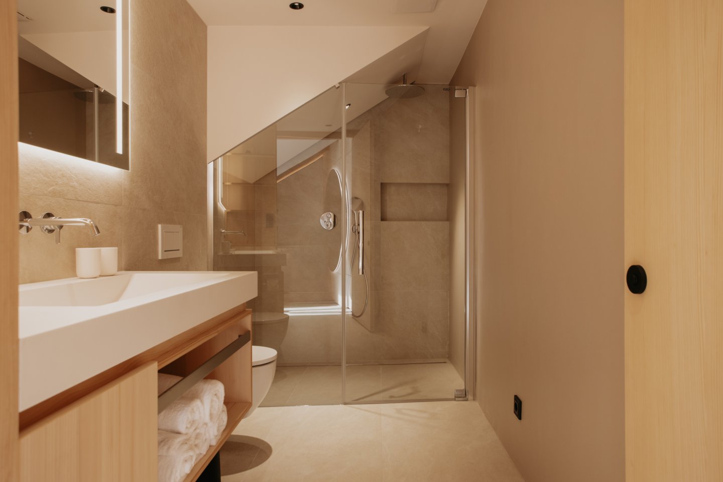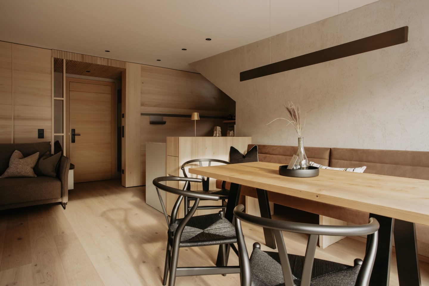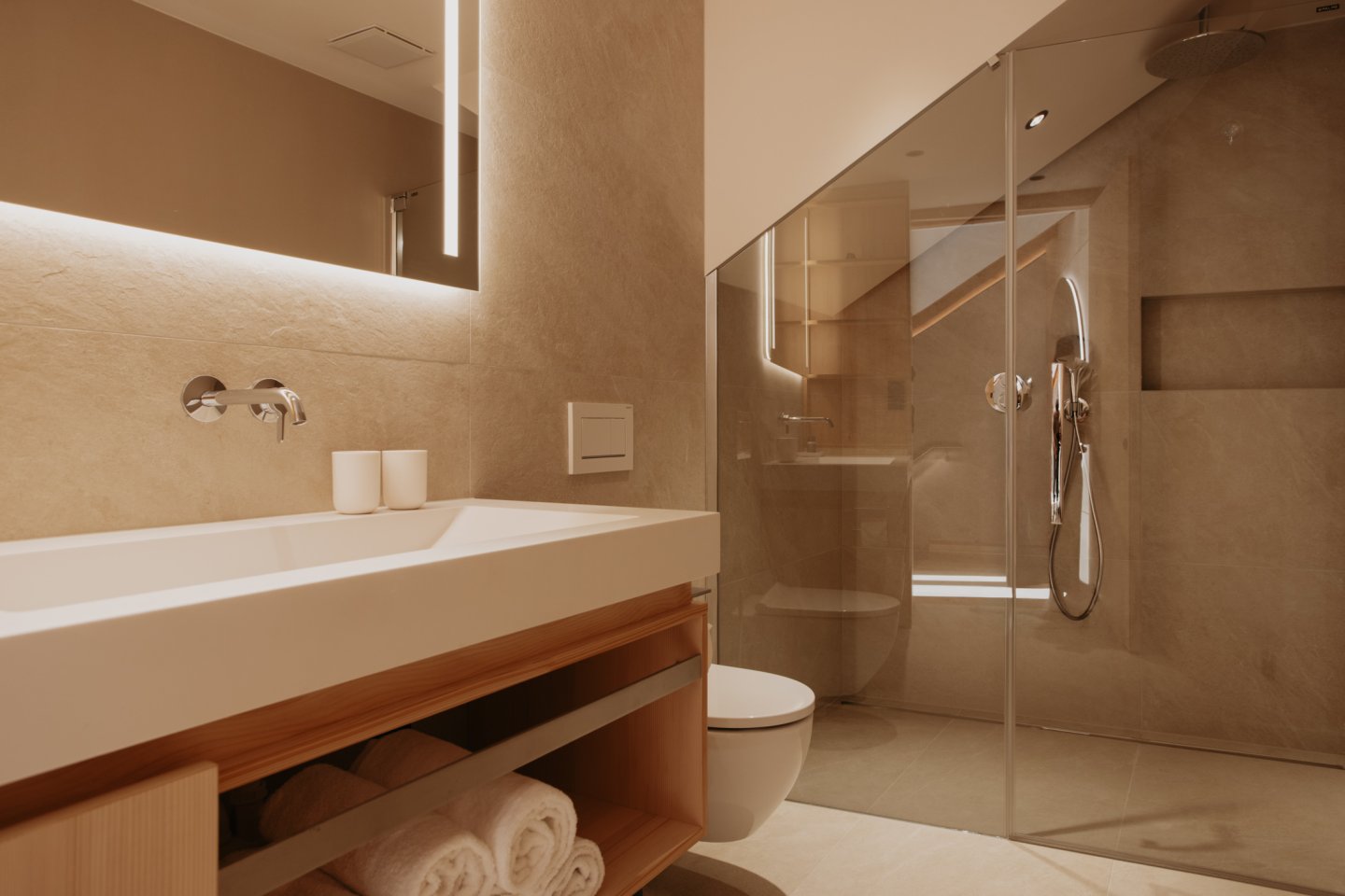 Dieses Apartment bietet Raum für 2 – 4 Personen und verbindet alpine Eleganz mit modernem Wohnkomfort. Hochwertige Materialien, klare Linien und der Blick nach Süden schaffen eine Atmosphäre, die Wärme und Weite zugleich ausstrahlt.